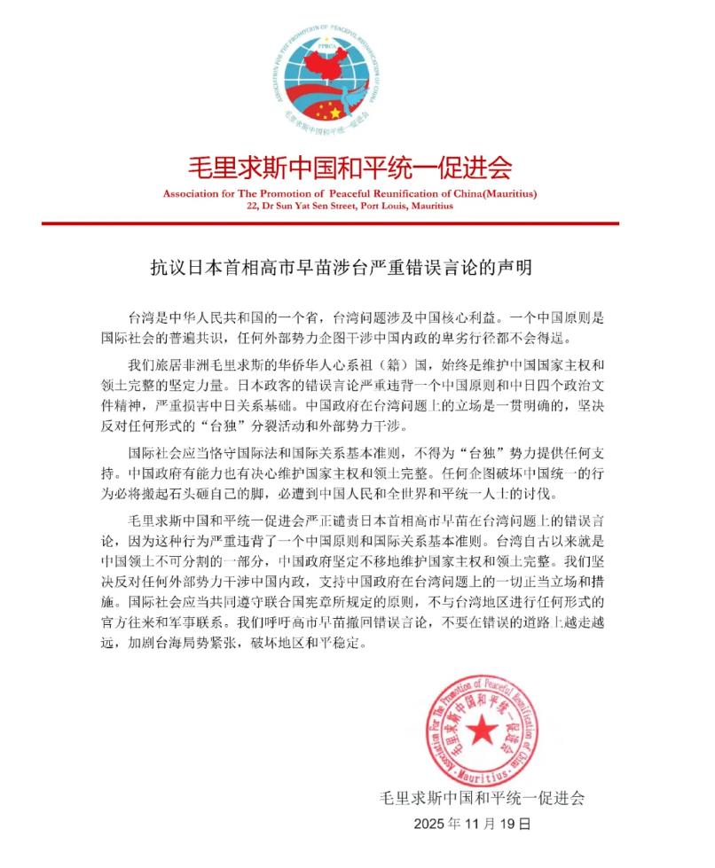 • 毛里求斯侨界发表声明谴责日本首相涉台错误言论 2025-11-26